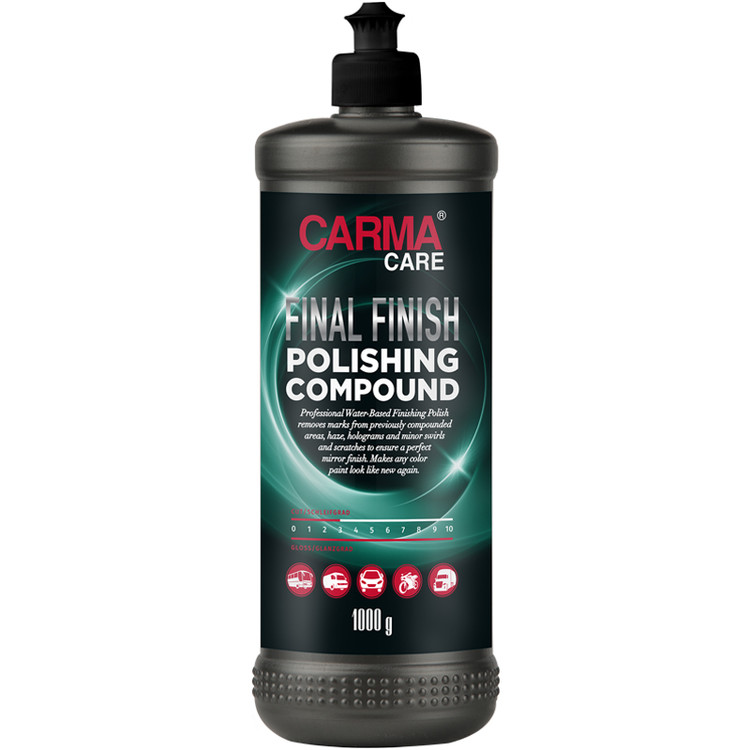 پولیش نهایی کارماکرپولیشی حرفه ای بر پایه آب می باشد و آنتی هولوگرام می باشد و باعث از بین بردن دائمی تمامی علائم و خراش های باقیمانده از پولیش های قبلی، کدورت رنگ، لکه های اب، هولوگرام ها و علایم چرخشی و خراش های جزئی تا حد سنباده P 3800 را از روی رنگ بدنه خودرو حذف کند و سطحی درخشنده و آینه ای ایجاد کند و باعث می شود رنگ خودرو مجددا کاملا نو به نظر برسد. این محصول برای صیقل دادن عیوب رنگ سنباده شده، اثرات گرد و غبار و یا شرهٌ رنگ ساخته شده است و اصلاح رنگ را با کمترین میزان نیروی کار و در کوتاهترین زمان نسب به روش سنتی استفاده از خمیر کلی انجام می دهد.